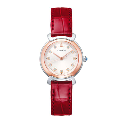ケースの18金ピンクゴールドと深みのあるレッドカラーのクロコダイルベルトにより、時計自体のシンプルなフォルムを美しく引き立てています。